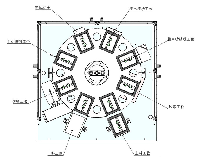 2. Paint removal and dipping tin are collected on one machine to improve efficiency, 10-35 seconds/tray (1-6 can be placed in a tray fixture, depending on the appearance of the product).